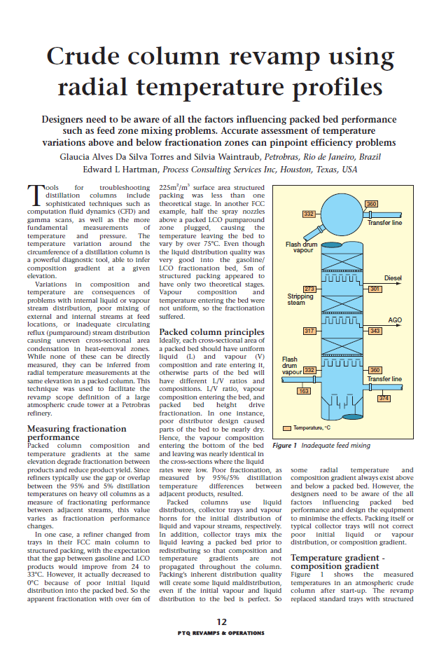 Variations in composition and temperature are consequences of problems with internal liquid or vapour stream distribution, poor mixing of external and internal streams at feed locations, or inadequate circulation reflux (pumparound) steam distribution causing uneven cross-sectional area condensation in heat-removal zones. While none of these can be directly measures, they can be inferred from radial temperature measurements at the same elevation in a packed column. This technique was used to facilitate the revamp scope definition of a large atmospheric crude tower at Petrobras refinery...