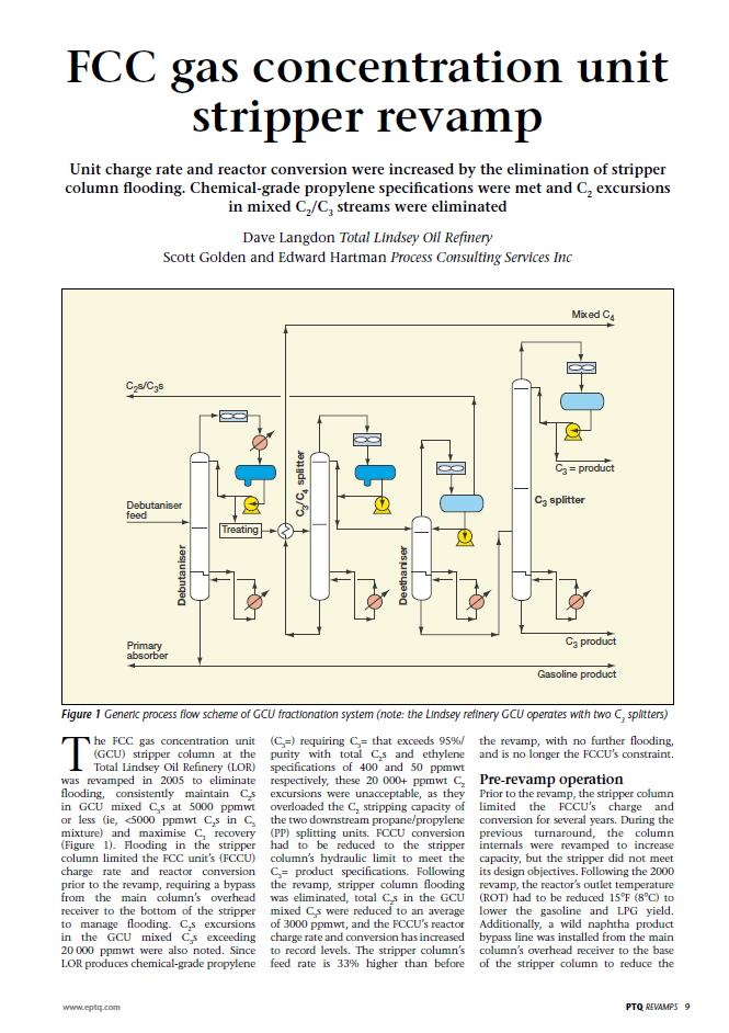 The FCC gas concentration unit (GCU) stripper column at the Total Lindsey Oil Refinery (LOR) was revamped in 2005 to eliminate flooding, consistently maintain C2s in GCU mixed C3s at 5000 ppmwt or less (ie, <5000 ppmwt C2s in C3 mixture) and maximize C3 recovery. Flooding in the stripper column limited the FCC unit’s (FCCU) charge rate and reactor conversion prior to revamp, requiring a bypass from the main column’s overhead receiver to the bottom of the stripper to manage flooding. C2s excursions in the GCU mixed C3s exceeding 20,000 ppmwt were also noted. Since LOR produces chemical-grade propylene (C3=) requiring C3= that exceeds 95%/purity with total C2s and ethylene specifications of 400 and 50 ppmwt respectively, these 20,000+ ppmwt C2 excursions were unacceptable, as they overloaded the C2 stripping capacity of the two downstream propane/propylene (PP) splitting units. FCCU conversion had to be reduced to the stripper column’s hydraulic limit to meet the C3= product specifications. Following the revamp, stripper column flooding was eliminated; total C2s in the GCU mixed C3s were reduced to an average of 3,000 ppmwt, and the FCCU’s reactor charge rate and conversion has increased to record levels. The stripper column’s feed rate is 33% higher than before the revamp, with no further flooding, and is no longer the FCCU’s constraint.